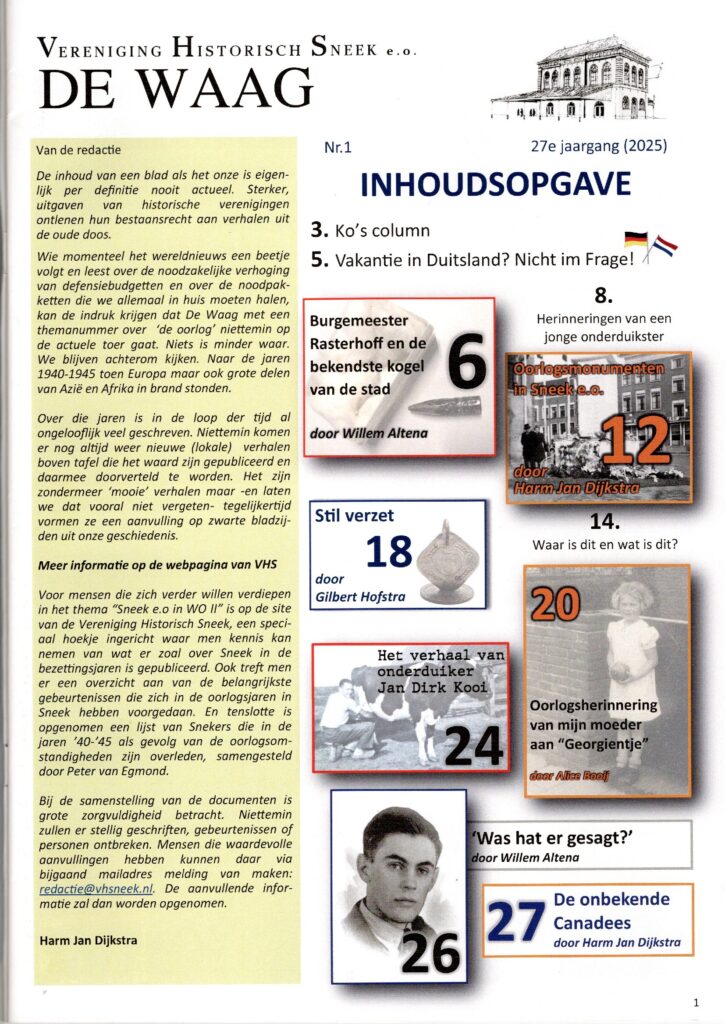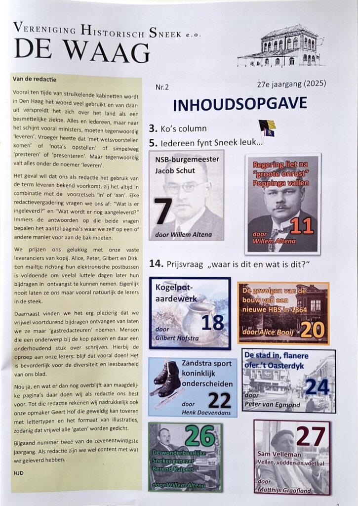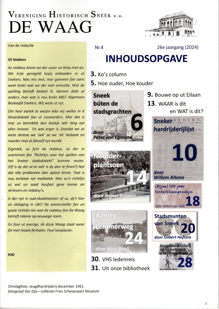 De Waag is het blad van onze vereniging. Het verschijnt vier maal per jaar en wordt bezorgd bij de leden thuis. Het blad doet verslag van activiteiten van de VHS en publiceert verhalen en foto’s over oud-Sneek.