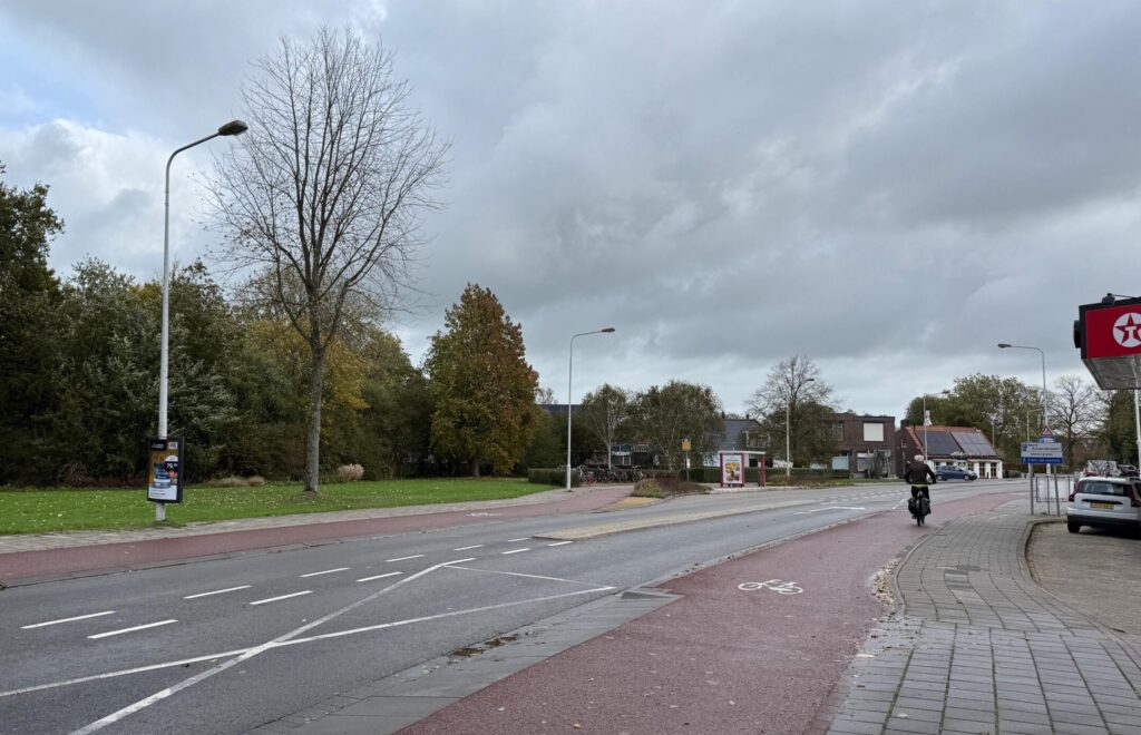 De oude foto toont links de tramloods, die later dienst deed als busremise, machinefabriek en kringloopwinkel. In 2001 ging het gebouw tegen de vlakte. Nu kuier je daar door het blijvend fraaie Wilhelminapark. Op de nieuwe opname is rechts een glimp van het huidige benzinestation Texaco Express te zien. In de verte, richting Oude Dijk, zit Van der Wal’s Snackbar. Rechts daarvan is de bewaakte overweg. Vroeger kruisten de (even brede) rails van de tram en de dieseltrein (Leeuwarden-Stavoren vice versa) daar elkaar. Maar wat was er het eerst? De tram, in 1882. De trein arriveerde een jaartje later…